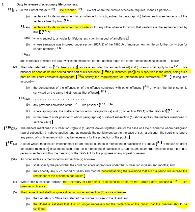 The Prisoners and Criminal Proceedings (Scotland) Act 1993 was enacted as a reaction to the Thynne case, and it’s the relevant piece of legislation when considering the treatment of life prisoners in Scotland today. I’ve tried to highlight the pertinent bits of this word salad for current purposes: